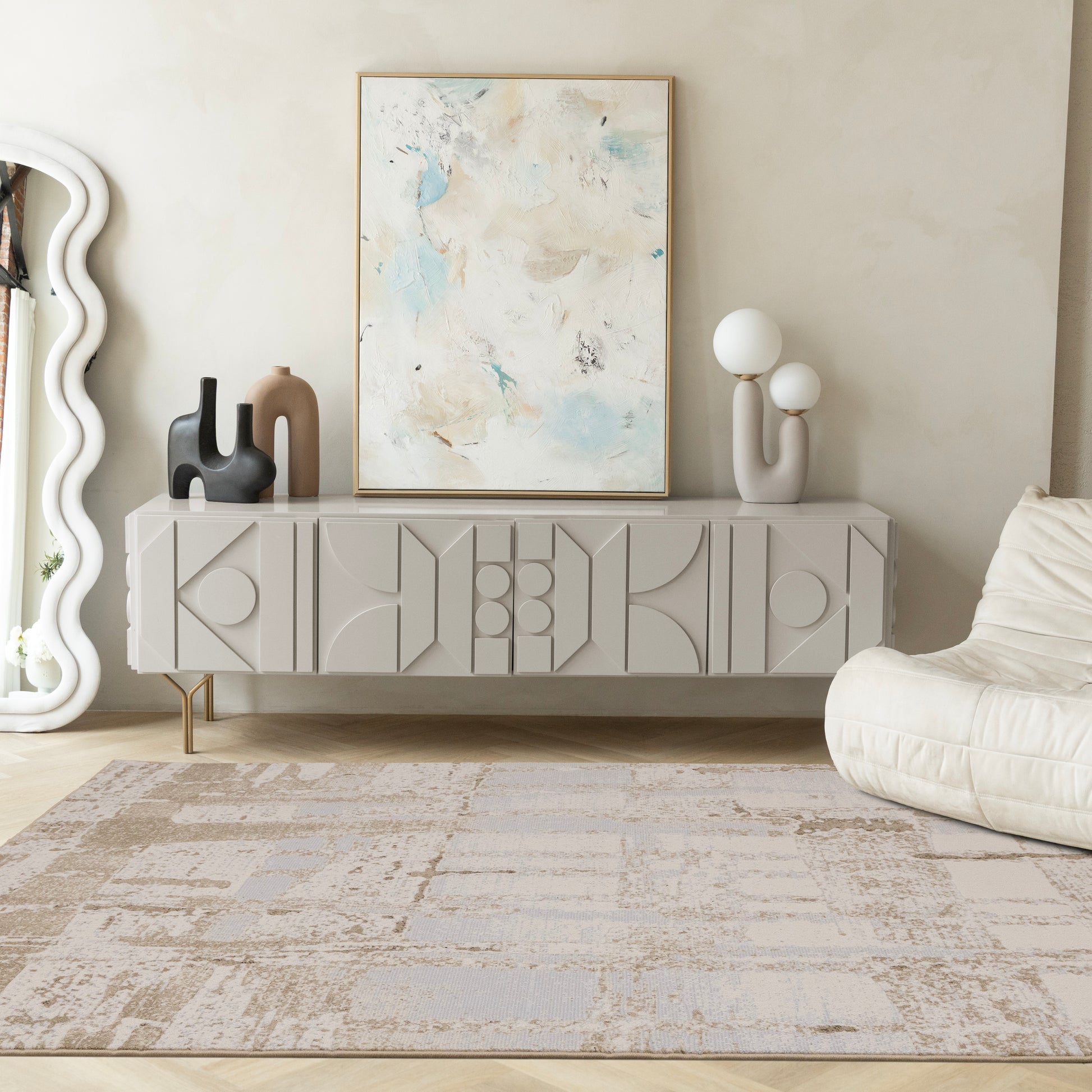 Inspired by an old world look, this Intrigue rug features cool tones with a contemporary style. Its dense pile and stitching embellishments offer extraordinary definition and luxury.